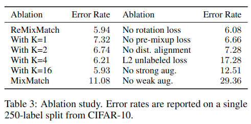 训练过程中维持模型对未标记数据的预测结果的平均值\(\tilde{p}(y)\),给定模型在未标记数据\(u\)上的预测为\(q=P_{\text{model}}(y|u,\theta)\),我们将利用\(\frac{p(y)}{\tilde{p}(y)}\)作为比例缩放\(q\),然后在重新放大到有效的概率分布区间: \(\tilde{q}=\text{Normalize}(q\times\frac{p(y)}{\tilde{p}(y)})\),其中Normalize为\(\text{Normalize}(x)_i=\frac{x_i}{\sum_j x_j}\)。 然后我们使用\(\tilde{q}\)作为\(u\)的猜测标签,然后可以再用sharpening或其他的处理方式。实际操作中,将计算过去128个batch中无标签数据预测值的滑动平均作为\(\tilde{p}(y)\),如果我们直接知道\(\tilde{p}(y)\)的某些先验分布,那么应该还可以更好。