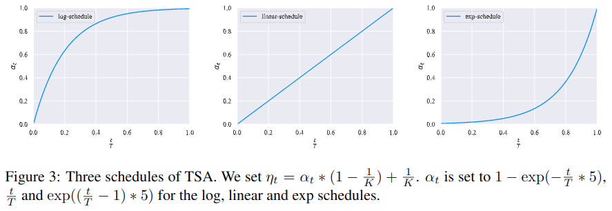 在半监督学习中,经常遇到一种情况,即未标记数据量和已标记数据量存在巨大差距。然后模型通常会快速拟合有限的已标记数据,而不足以拟合未标记数据。为了解决这个问题,提出了一种训练信号退火TSA的方法,随着训练会逐渐释放带标签的样本的信号,就是在模型对于样本的置信度低于阈值\(\eta_{t}\)的时候情况下,才使用带标签的样本,如果模型对于正确类别的预测概率高于阈值,那么要从损失函数中删除这个样本,这就是为了防止出现过度训练。