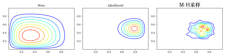 make_plots(X, Y, prior(X, Y), lik(X, Y), posterior_metroplis)
