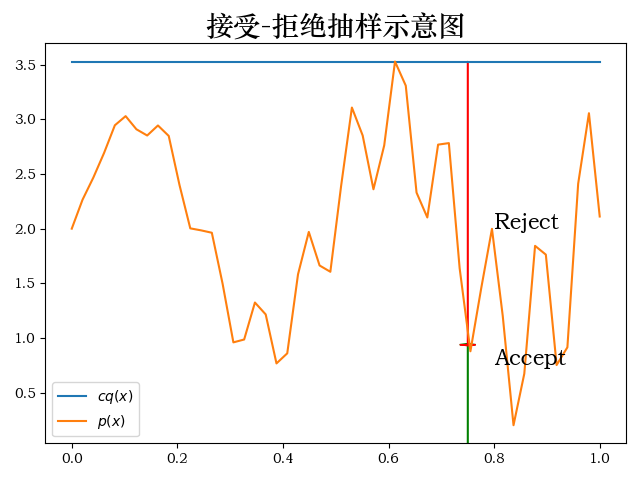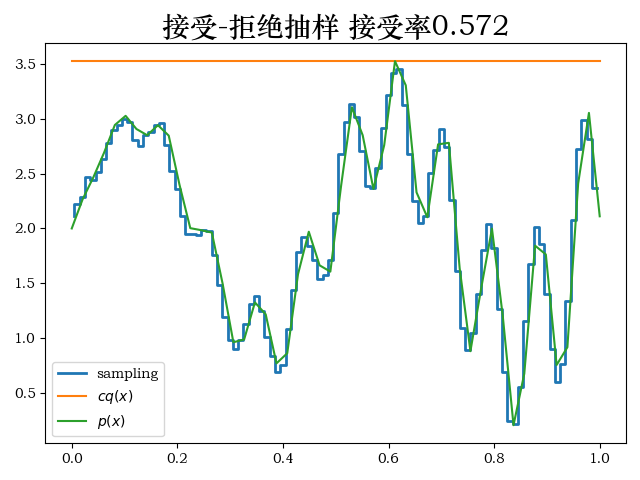 plt.show()当我给定目标分布为\(p(x)=x\cos(71x)+\sin(13*x)+2\),建议分布为\(q(x)\sim U(0,1)\),\(c\)为目标分布大最大值,抽样的示意图如下所示: