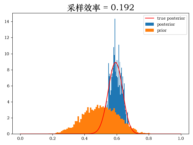 plt.show()经过采样后我们统计采样结果的分布,可以发现和后验概率分布相同.不过可以看到他的接受率并不高.