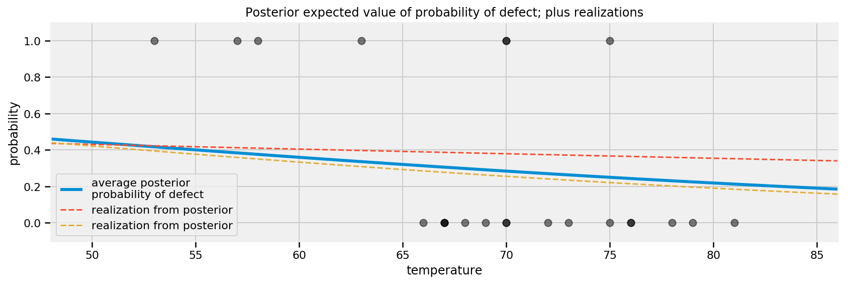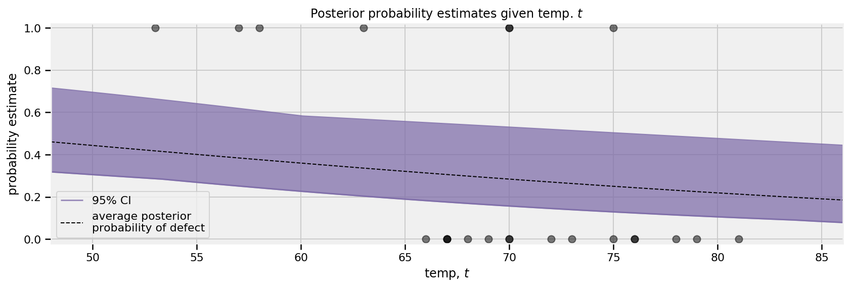 对于每个模型,我们计算后验模拟为特定温度提出值1的次数,即通过平均计算\(P(\; \text{缺陷} = 1 | t,\alpha,\beta)\)。这为我们提供了数据集中每个数据点的缺陷后验概率。例如,对于我们上面使用的模型:
