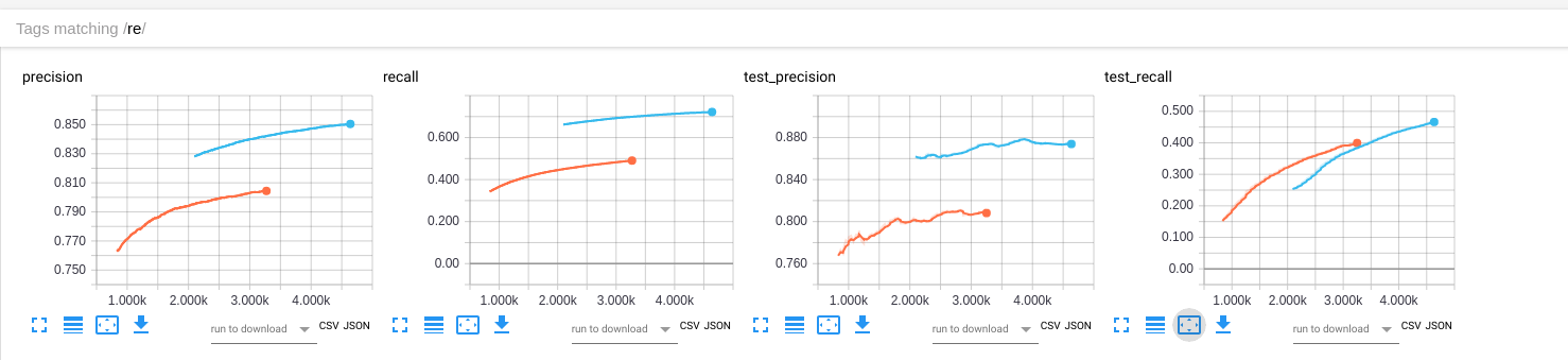 首先看precision和recall曲线,其中蓝色的是迁移学习模型训练过程,后面记为yolonet.橙色的是我自定义的模型训练过程,后面记为pureconv.