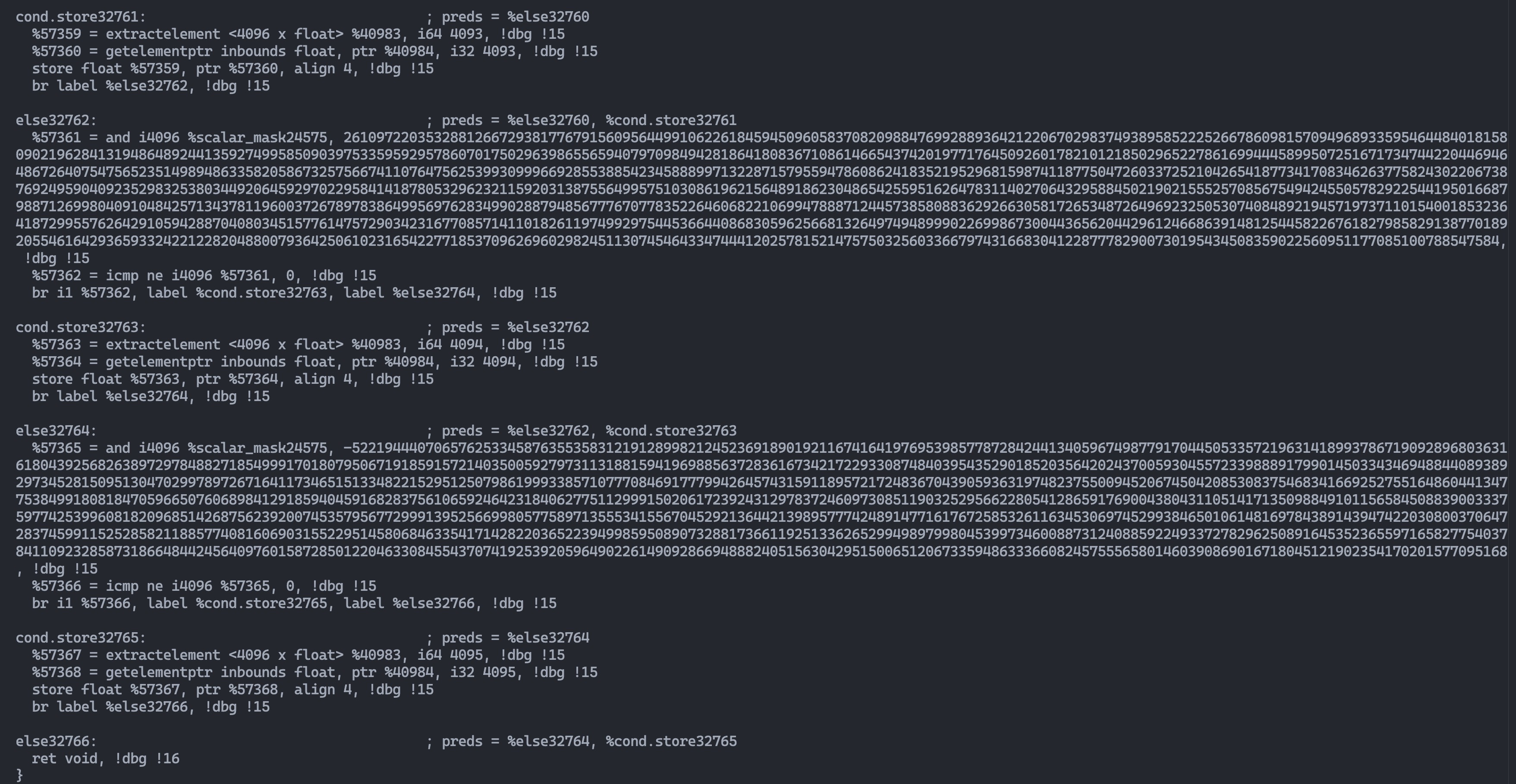我尝试执行最简单的例子,但是他会卡死在生成asm,然后我发现dump的llvm ir非常奇怪, 有32768个数: 然后发现vector add中又有:
